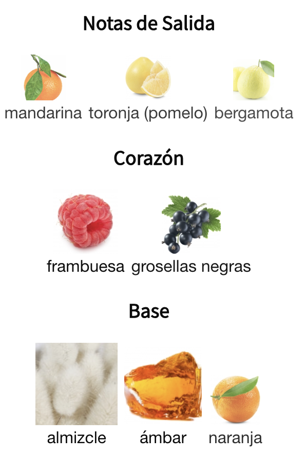 Salida: Mandarina jugosa 🍊, Bergamota brillante 🍋, Frambuesa dulce 🍓 y Manzana fresca 🍎