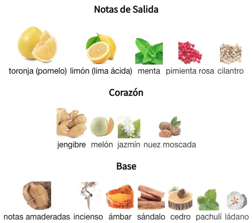 Corazón: Jengibre, nuez moscada, melón y jazmín — especias vibrantes con toque frutal