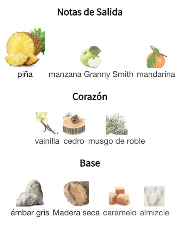 Corazón: Cedro terroso 🌲, Musgo de roble profundo 🌿 y Vainilla cremosa 🍦