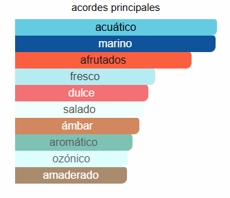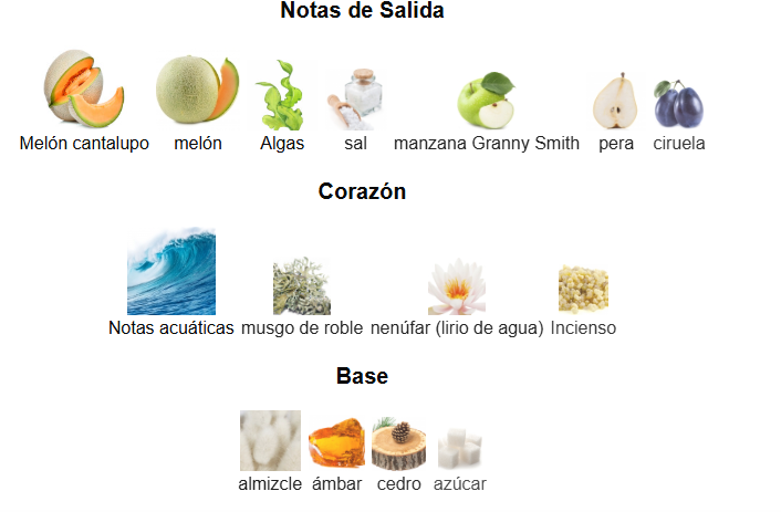 Acuático – Marino – Afrutado – Fresco – Dulce – Salado – Ámbar – Aromático – Ozónico – Amaderado