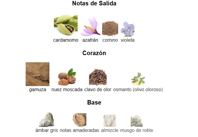 Una fragancia rica en especias, gamuza y maderas, con un fondo ambarado que la hace cálida, sensual y memorable. Un perfume con carácter, ideal para quienes quieren destacar con elegancia.