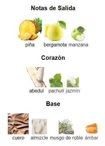 • Fondo: Cuero, Almizcle, Musgo de Roble y Ámbar. (La base que define su carácter: intensa, cálida y de larga duración).