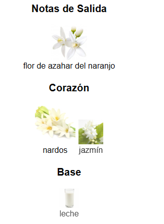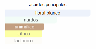 Acordes principales: Floral blanco, nardos, cítrico, lactónico, ligeramente animálico.