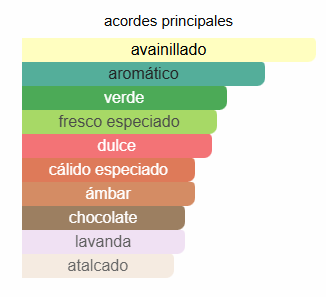 Acordes principales: Avainillado, aromático, verde, fresco especiado, dulce, cálido especiado, ámbar, chocolate, lavanda y atalcado