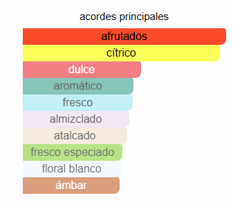 Acordes principales: Afrutado, cítrico, dulce, aromático, fresco, almizclado, atalcado, fresco especiado, floral blanco y ámbar